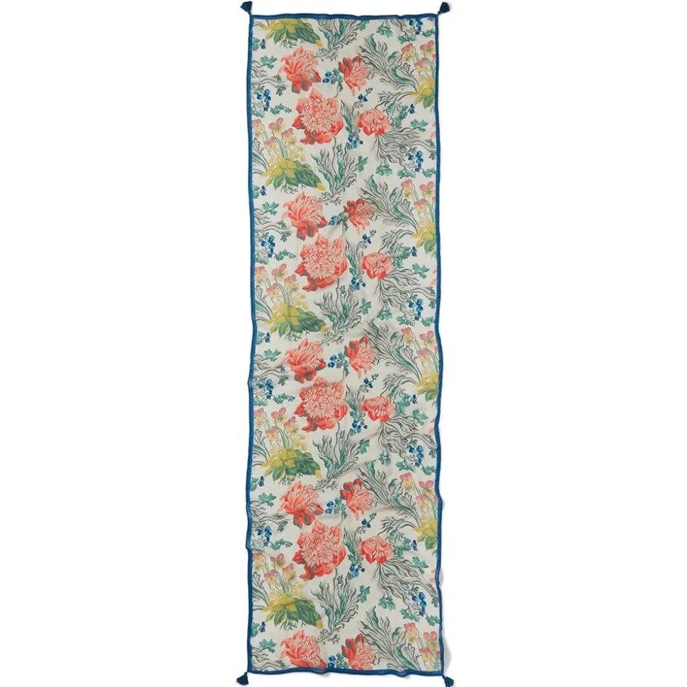 Elevated with stylish tassels, this sumptuous shawl pays tribute to the colorful blooms on an 18th-century silk fragment in The Met’s European Sculpture and Decorative Arts collection. Possibly Venetian or French, the Museum’s woven textile bears a timeless motif of various stylized flora.