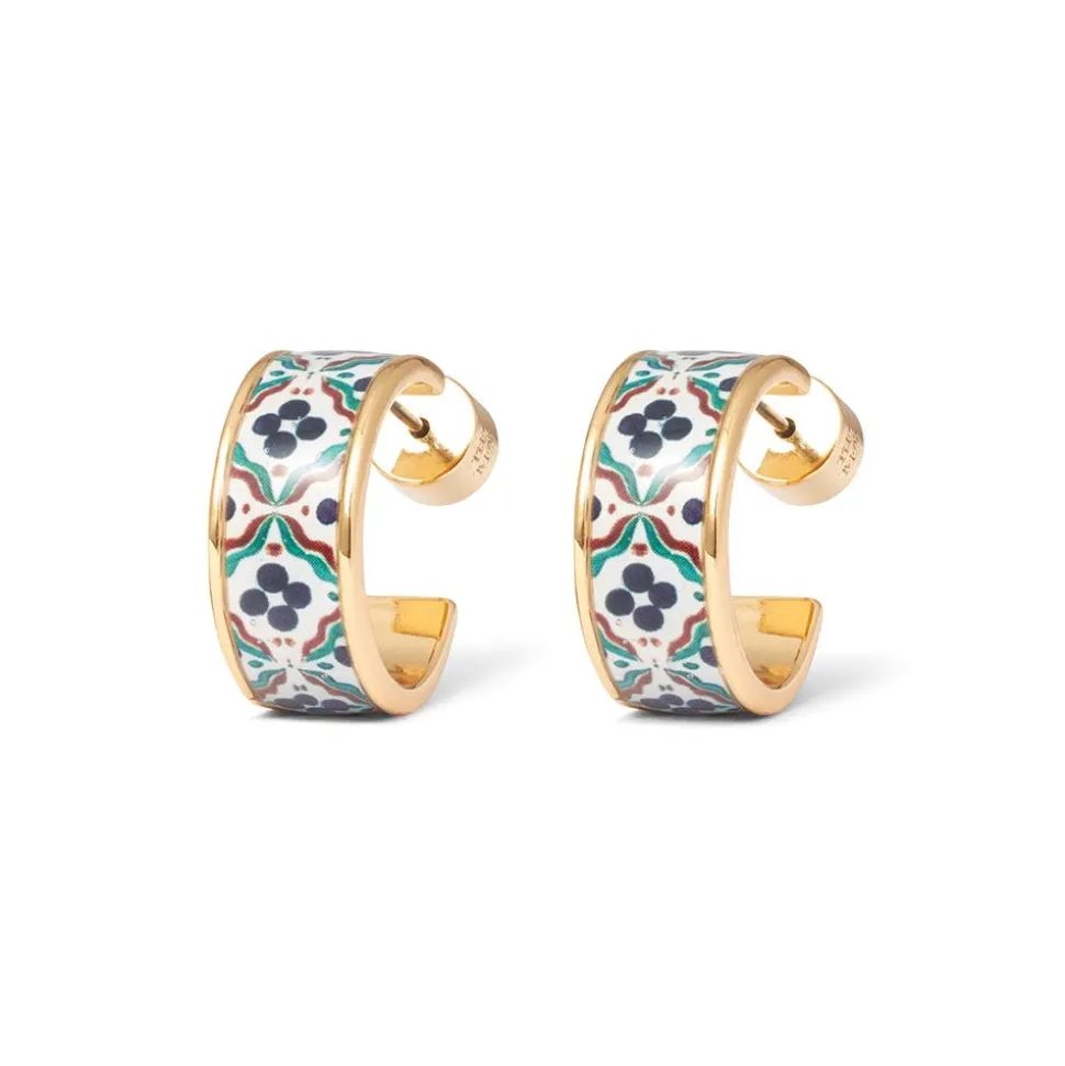These striking enamel hoops celebrate the decoration on a painted dish (ca. 1575–90) crafted in Turkey’s renowned Iznik kilns and now in The Met collection. The pattern is a variant of a motif known as çintamani, which is Sanskrit for “auspicious jewel.” The circles and wavy stripes typically represented auspicious flaming pearls, but in the Ottoman context, they were associated with tiger stripes and leopard spots, symbols of strength and courage. The design originated in Buddhist iconography, and appears on ceramics, carpets, and textiles.