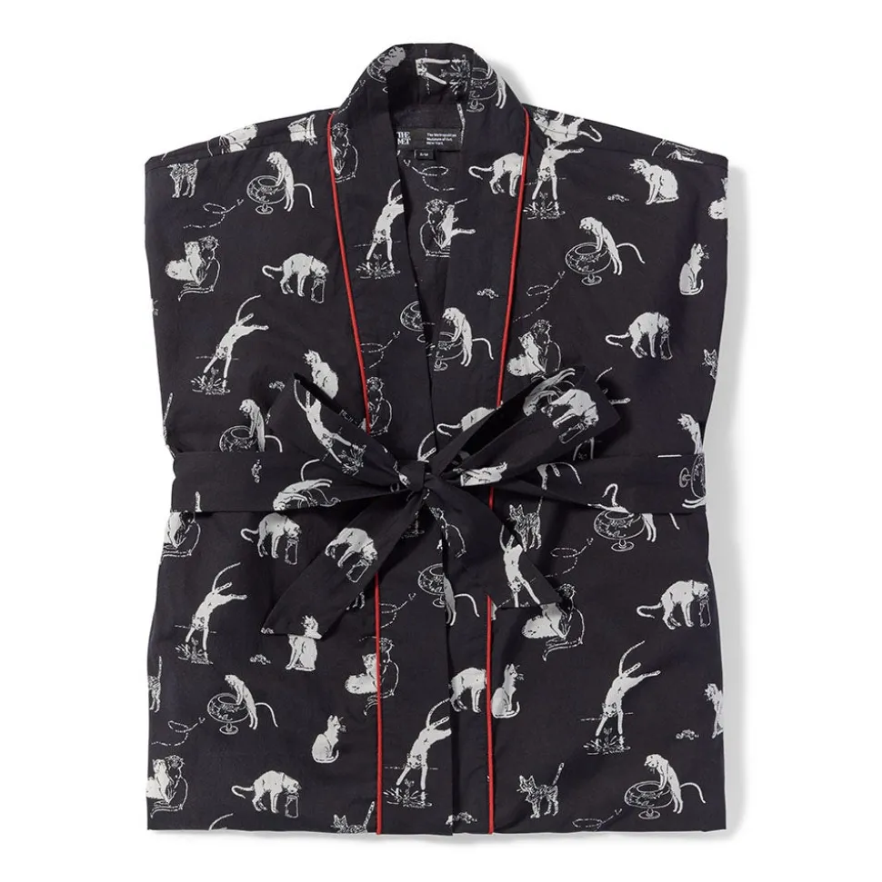 This cotton robe celebrates the graphic artist Théophile-Alexandre Steinlen’s (French, b. Switzerland, 1859–1923) fondness for felines. He drew cats throughout his long career with unvarying grace and skill—his models were the habitués of Parisian rooftops, streets, cemeteries, and garbage bins around the Montmartre neighborhood where he resided. Their antics are illustrated in the artist’s famous book Cats: Pictures without Words (1898), a copy of which is in The Met’s Drawings and Prints collection.