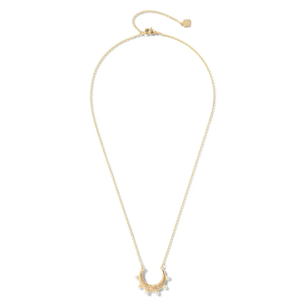 Our classic pendant in 18k gold plate is adorned with tiny glass pearls, a lovely detail that catches the eye. Featuring a 16″ chain with a 2″ extender, it coordinates with our matching Hammered Crescent Pearl Earrings.