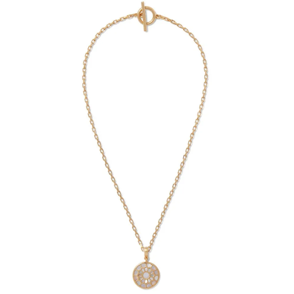 The naturally iridescent mother-of-pearl pendant adorning this necklace reinterprets a lustrous Indian powder flask (18th–19th-century) in The Met collection. Crafted in Gujarat for the export market, this artful vessel of shimmering green turban shell was created to contain gunpowder. The Museum is home to a vast collection of diversely decorated powder flasks from around the world.